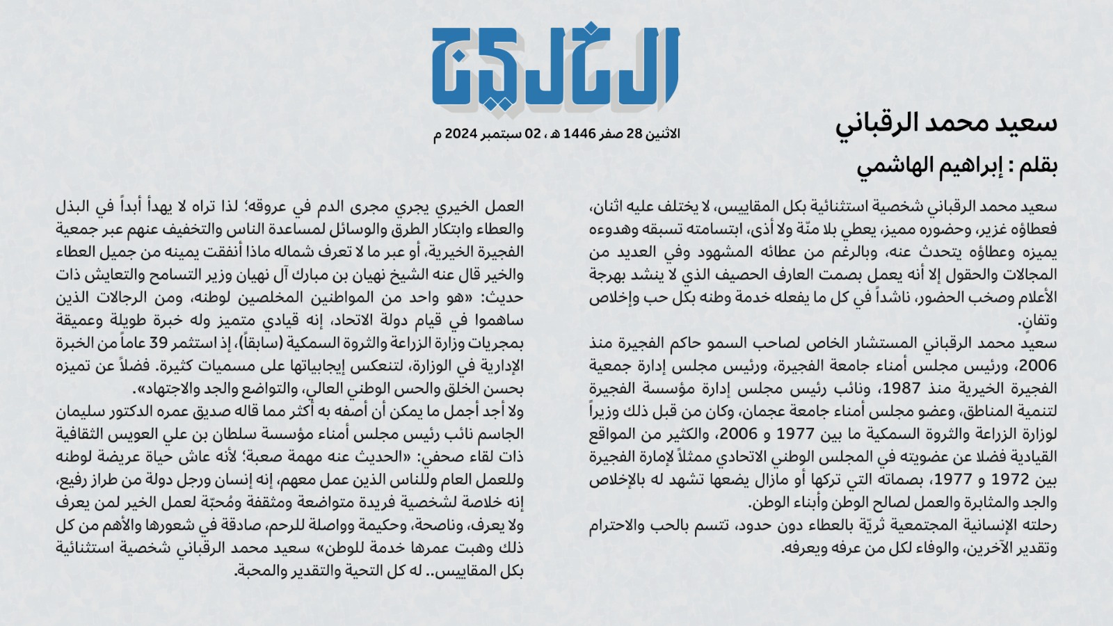 سعيد محمد الرقباني المستشار الخاص لصاحب السمو حاكم الفجيرة منذ 2006، ورئيس مجلس أمناء جامعة الفجيرة، ورئيس مجلس إدارة جمعية الفجيرة الخيرية منذ 1987، ونائب رئيس مجلس إدارة مؤسسة الفجيرة لتنمية المناطق، وعضو مجلس أمناء جامعة عجمان، وكان من قبل ذلك وزيراً لوزارة الزراعة والثروة السمكية ما بين 1977 و 2006، والكثير من المواقع القيادية فضلا عن عضويته في المجلس الوطني الاتحادي ممثلاً لإمارة الفجيرة بين 1972 و 1977، بصماته التي تركها أو مازال يضعها تشهد له بالإخلاص والجد والمثابرة والعمل لصالح الوطن وأبناء الوطن.