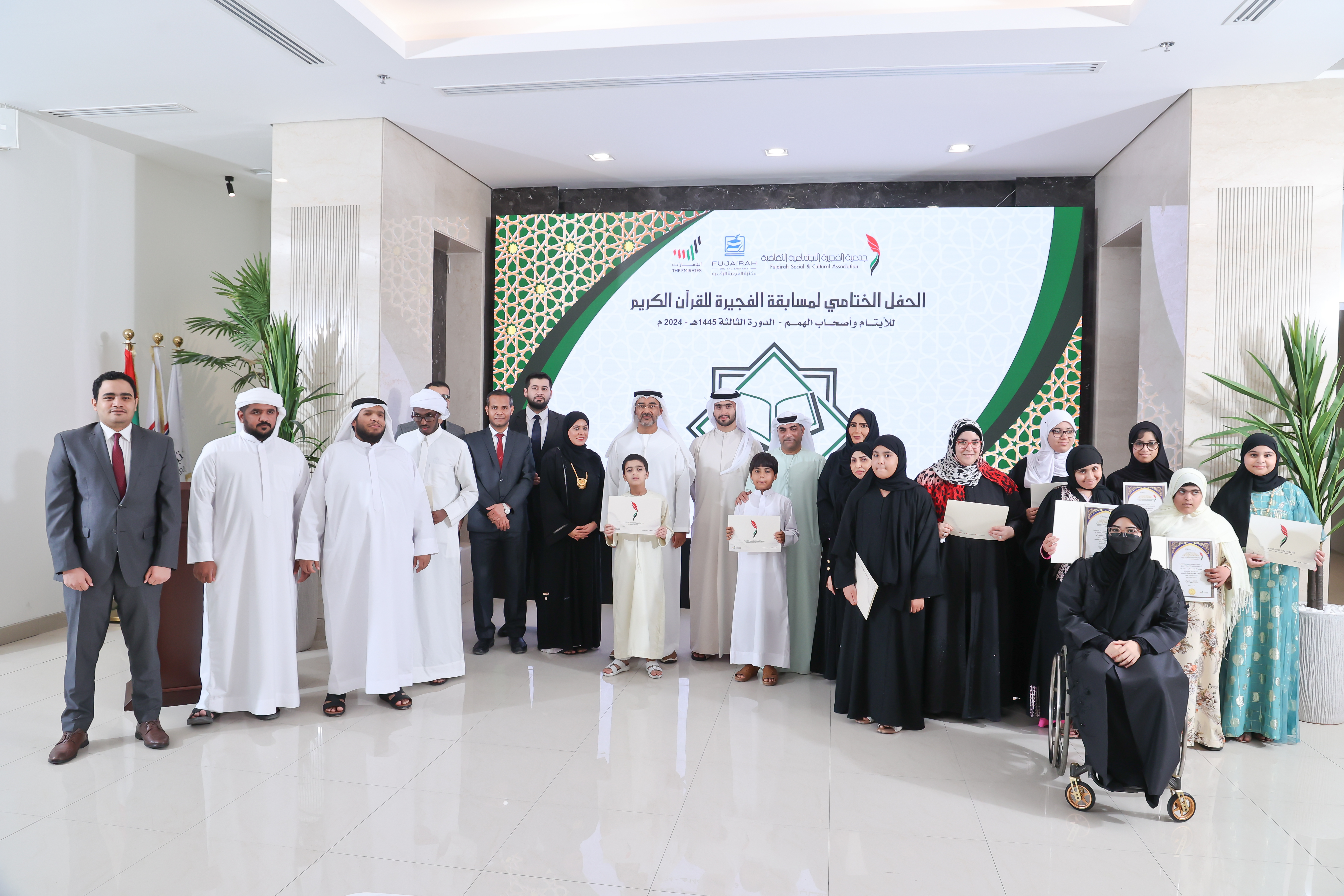 استضافت مكتبة الفجيرة الرقمية حفل ختام مسابقة الفجيرة للقرآن الكريم الموجهة للأيتام وأصحاب الهمم في دورتها الثالثة، والتي نظمتها جمعية الفجيرة الاجتماعية الثقافية تحت شعار "إقرأ وإرتق". ، وشهد الحفل حضوراً لافتاً لكبار الشخصيات، بما في ذلك الشيخ حمد بن محمد بن حمد بن سيف الشرقي، والدكتور خالد الظنحاني، رئيس مجلس إدارة الجمعية، إلى جانب عدد من الشخصيات البارزة في المجتمع.