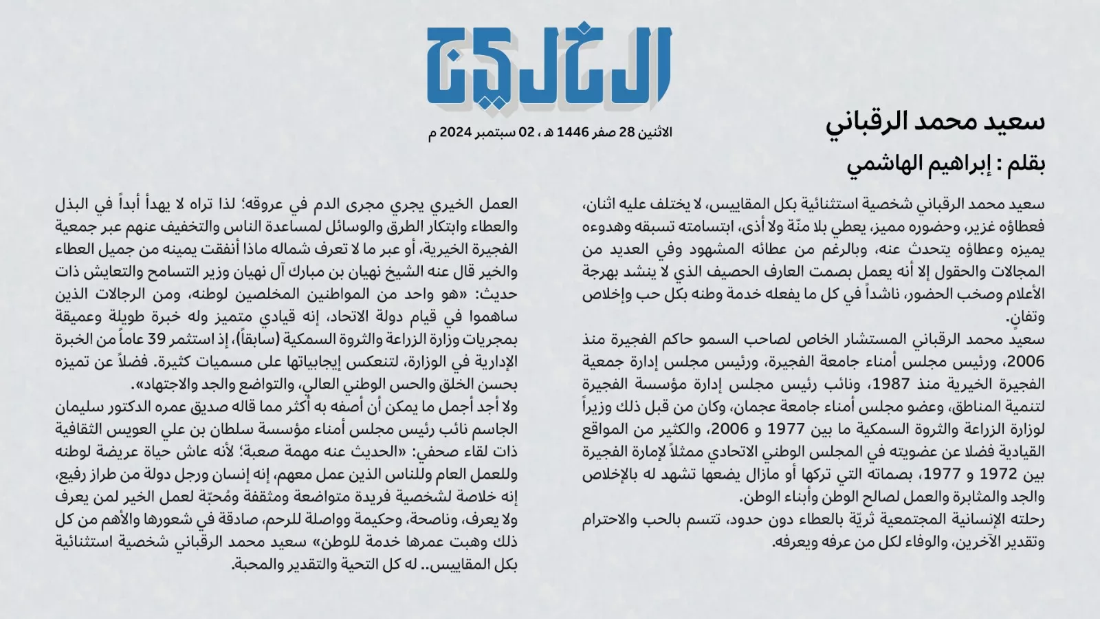 سعيد محمد الرقباني شخصية استثنائية بكل المقاييس، لا يختلف عليه اثنان، فعطاؤه غزير، وحضوره مميز، يعطي بلا منّة ولا أذى، ابتسامته...